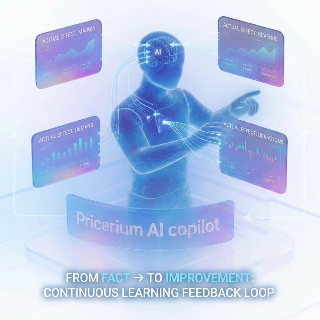 After implementation, the system measures the actual effect: changes in margin, revenue, demand, and deviations from the forecast. This data is returned to the agent layer, updating models and rules. Copilot takes the result into account in subsequent decisions, constantly improving the quality of recommendations.